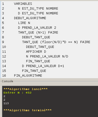 La prof m'a conseillé d'écrire avec xcas et/ou algobox, un algorithme donnant la décomposition en facteurs premiers d'un nombre et c'est mieux que l'autre idée d'algo que j'avais(celle du début du topic) Pour cela, voilà un algorithme assez simple qui permet de trouver un nombre n de nombre premier. La première étapes en utilisant Programmation et algorithmique systèmes d'exploitation sciences de la nature. B) qu'affiche le programme en sortie si le nombre entré est premier ? 1 variables 2 i est_du_type nombre 3 j est_du. 19 est un nombre premier. Le test de sa primalité est effectué par le test de miller rabin. Voici un algorithme simple pour générer tous les nombres premers,sans recours à la crible d'ératosthène.je l'ai écrit en qbasic. Mathsontologie est à l'arithmétique, ce que les logiciels de géométrie dynamique sont à la géométrie : Si n est le produit de deux nombres premiers, elle est la seule factorisation possible. Algorithme pour réaliser ceci, on écrit la liste de tous les nombres jusqu'à nbremax. Nombres premiers entre eux :